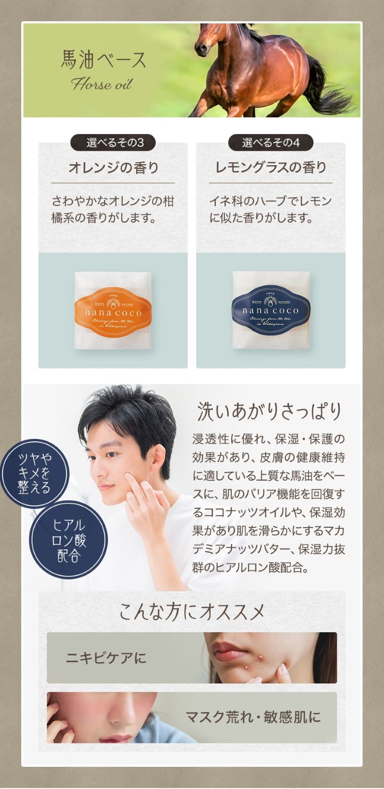 オレンジの香り:馬油、精製水、グラニュー糖、パーム硬化油、エタノール、グリセリン、水酸化Na、ココナッツ油、ひまし油、オレンジスイート、木酢液、マカデミアナッツバター、塩化Na、トレハロース、ヒアルロン酸