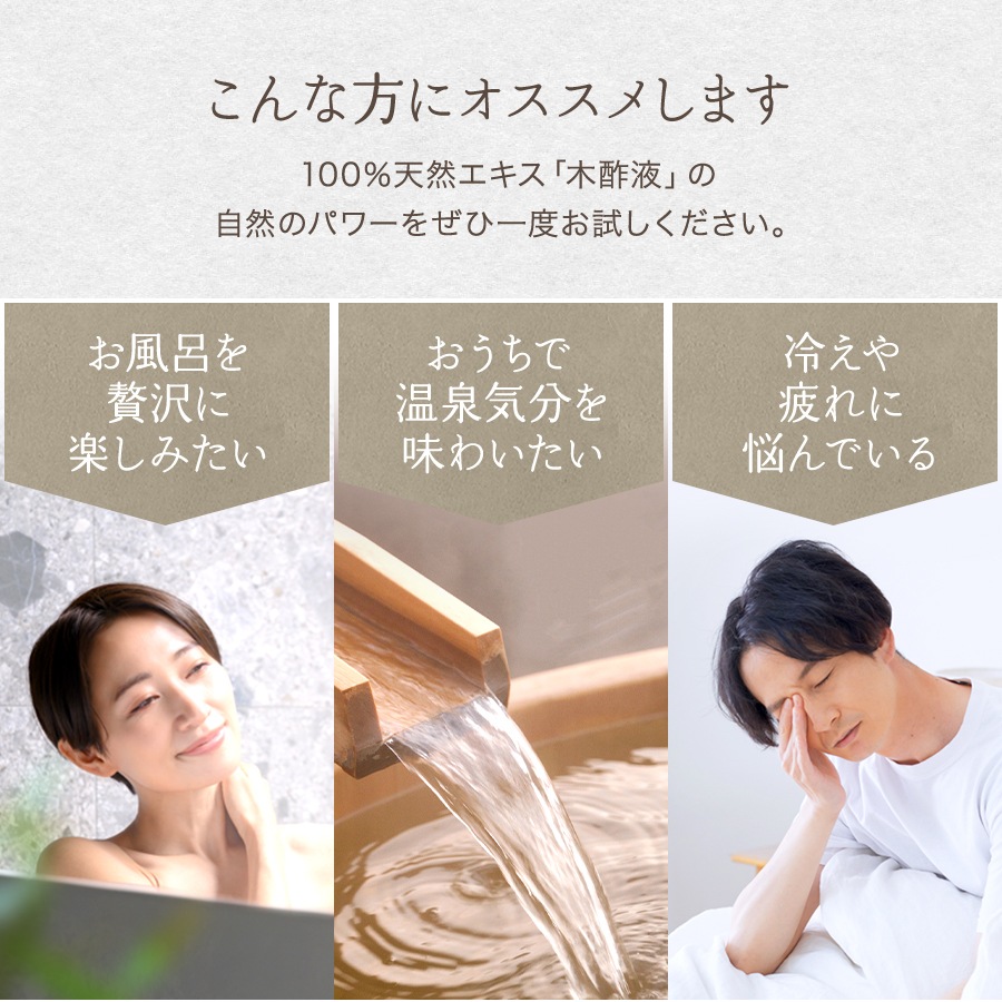 お風呂用…入浴剤としてお使いいただくことで、自宅でぽかぽか温泉気分・森林浴気分を味わうことができます。