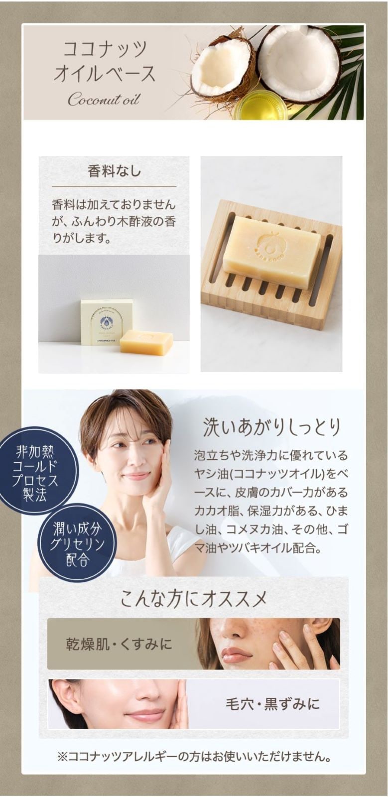 ※ココナッツアレルギーの方はヤシ油ベース石鹸はお使いいただけません。