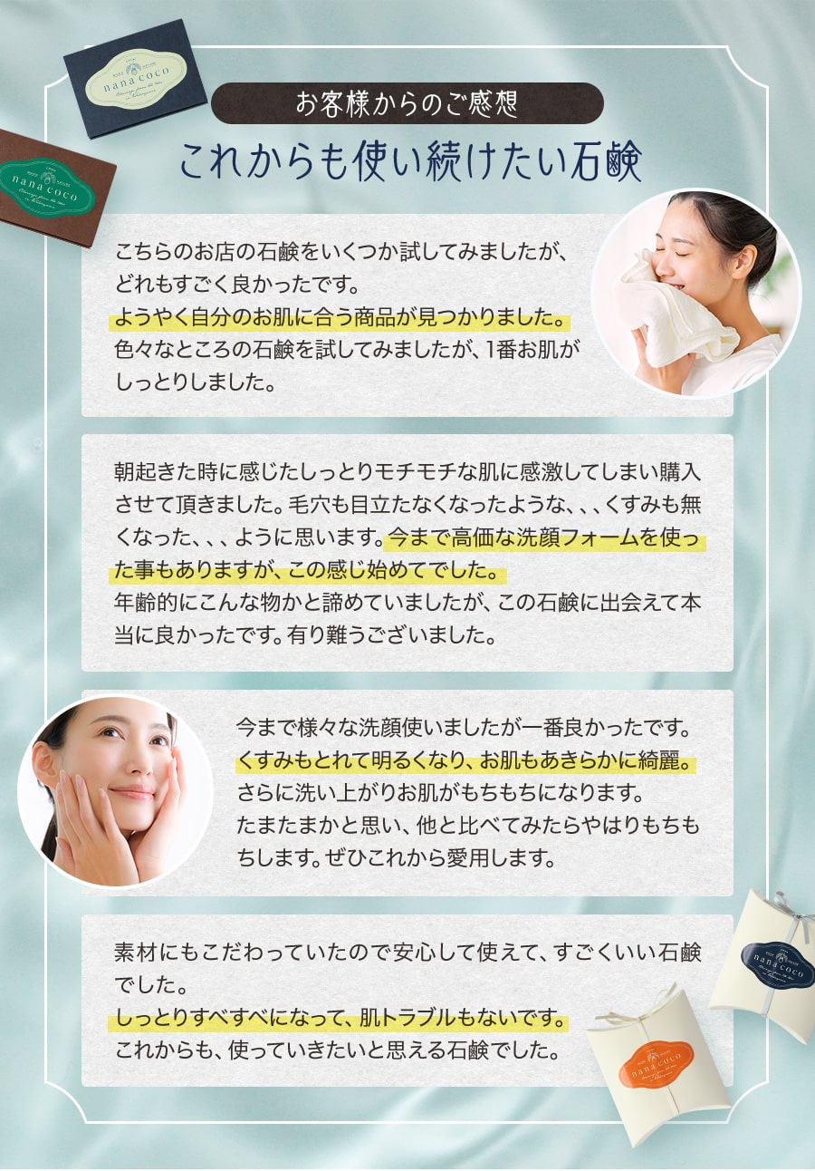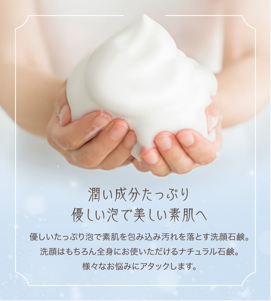 お肌トラブルでお悩みの方に「やっと出会えた洗顔石鹸」「手放せなくなる石鹸」とお喜びのお声をいただいている無添加石鹸です。