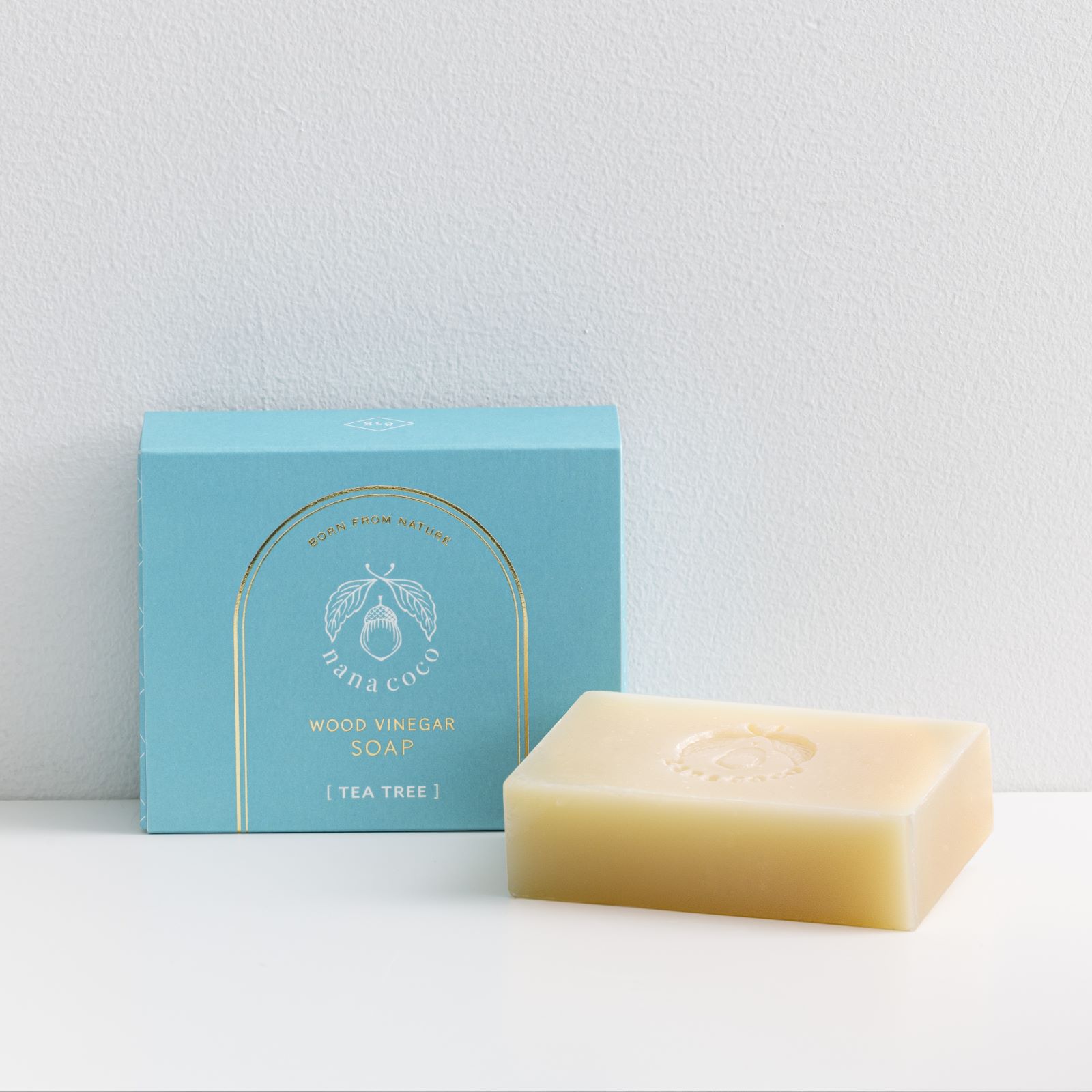 ティートゥリーの香り:ヤシ油、水、シアバター、コメヌカ油、水酸化Na、ゴマ油、ティートゥリー、木酢液、ツバキ油